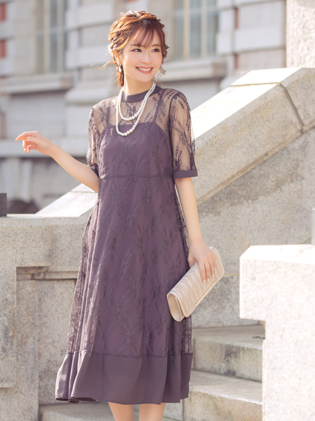 デコルテシースルーレース切り替え膝丈ワンピースパーティードレス