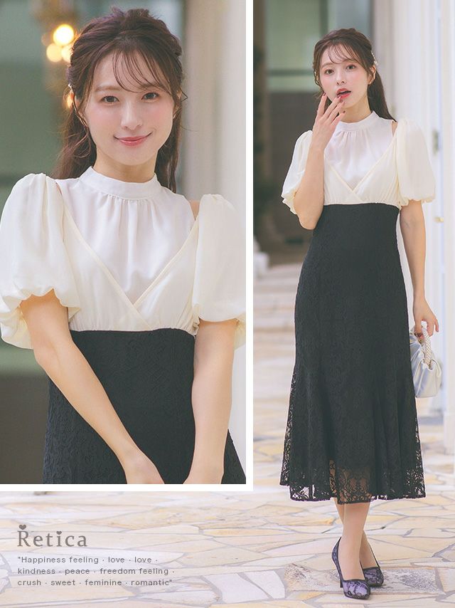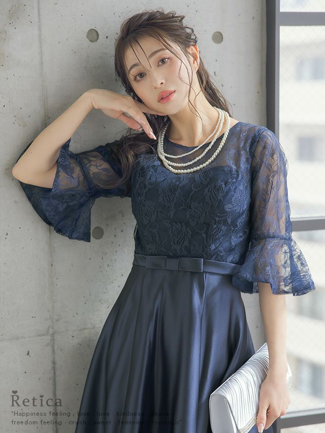 レース×サテンアンブレラスリーブミディアム丈パーティードレス