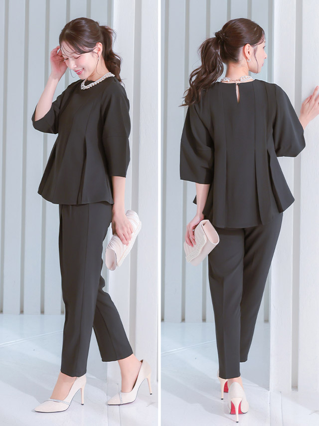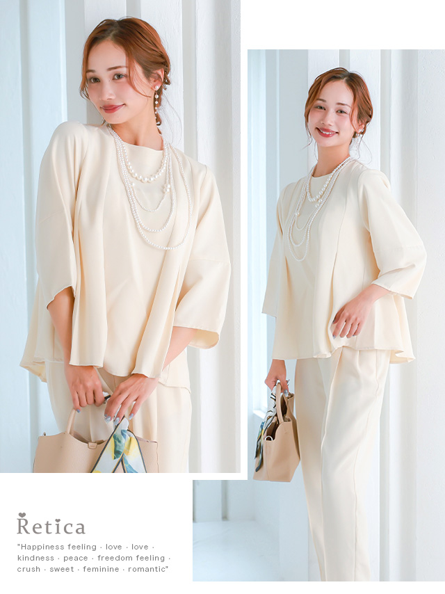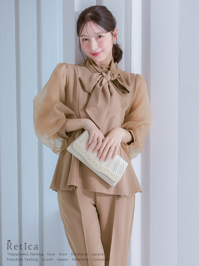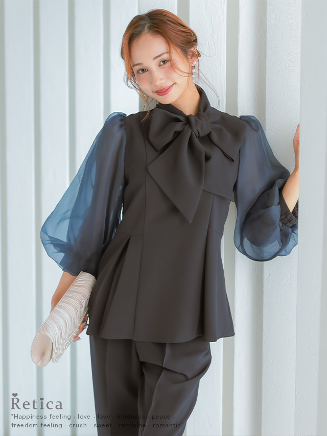 シアー袖 ペプラム 2way ボウタイ パンツドレス セットアップ