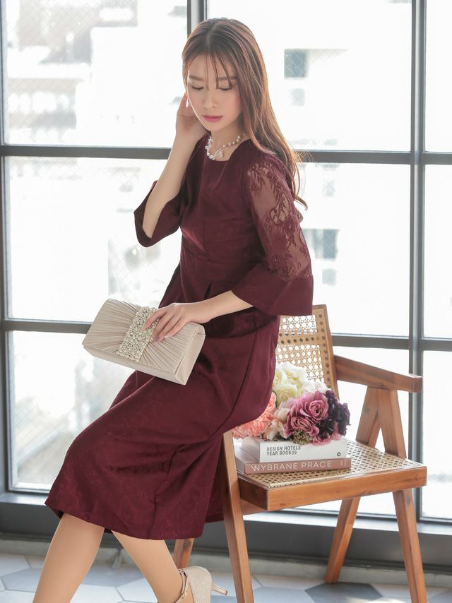 アラベスク柄レース袖シースルー膝丈ワンピースパーティードレス (Sサイズ~XXLサイズ)