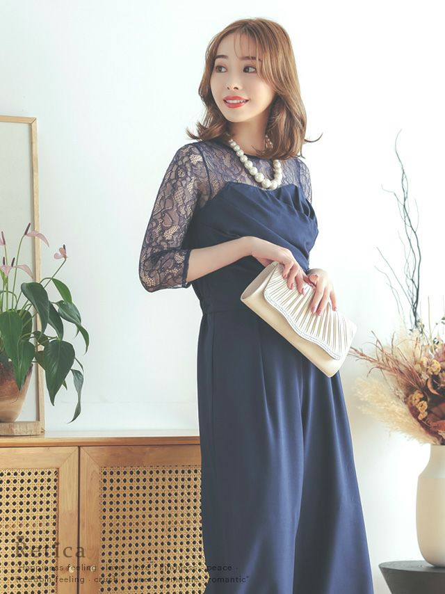 カシュクール風七分袖ワイドパンツオールインワンパーティードレス (Sサイズ~XXXLサイズ) [Retica/レティカ]