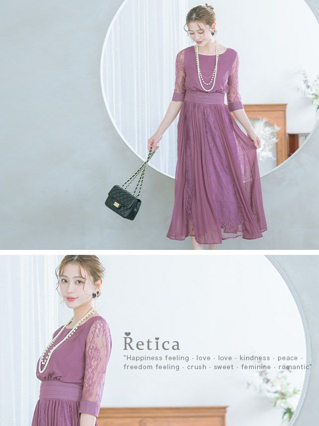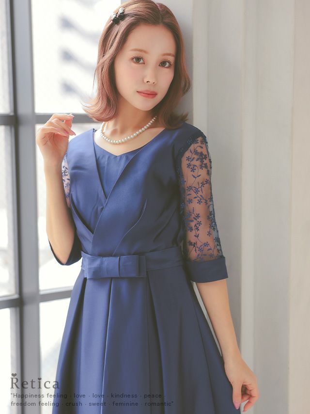 サテン生地クロスデザインレース七分袖ミディアム丈パーティードレス (XSサイズ~4Lサイズ)