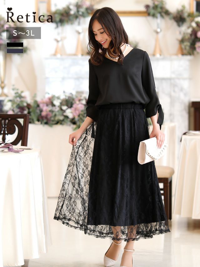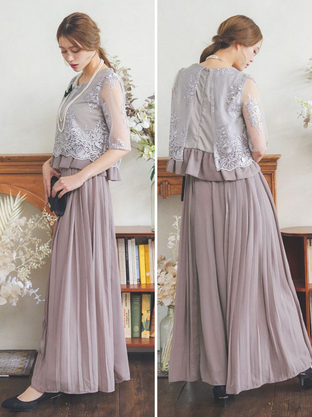 ツーピースワンカラー袖ありレースフレアロングスカートプチプラパーティードレス