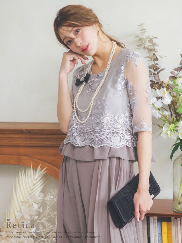 七分袖エンブロイダリーフラワーレースドレープシフォンワイドパンツセットアップパーティードレス