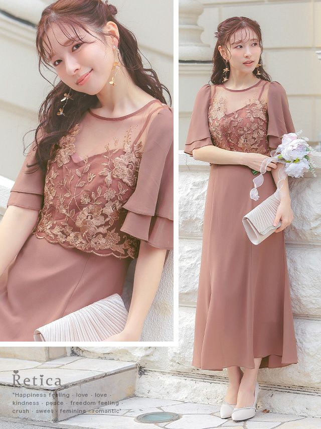 繊細なレース遣いが上品なミモレ丈パーティードレス