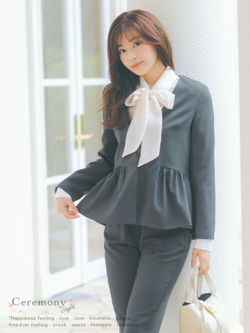 ノーカラーペプラムジャケット×パンツセットアップセレモニースーツ