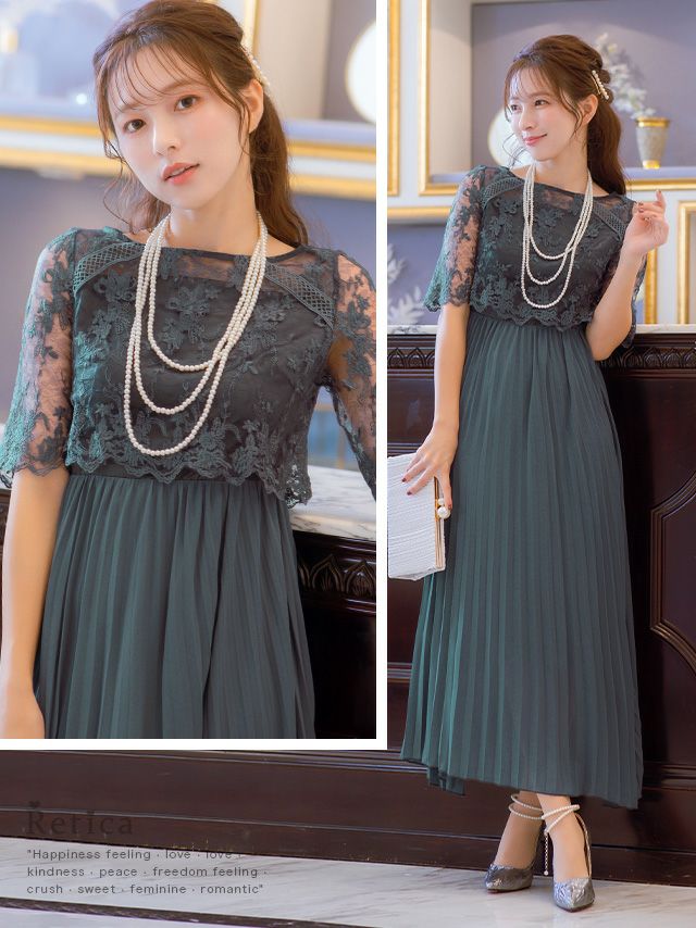 フラワー刺繍レース×プリーツ切り替えミモレ丈パーティードレス