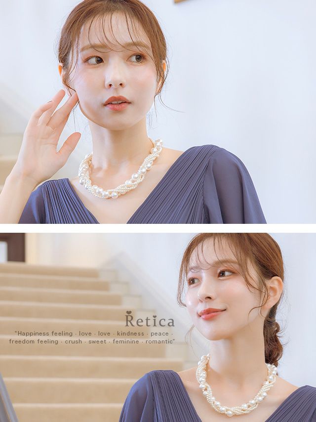Reticaではお昼の結婚式にオススメのパールビーズネックレスや、夜の時間帯の結婚式に着用してもOKのキラキラしたビジューネックレスなど多彩な種類をご用意しました。 結婚式・披露宴に参加する際のアクセサリーを選ぶポイントはキラキラと派手になりすぎない事です。 近頃は光る素材を使用したアクセサリーの着用も大丈夫になってきましたが、やはり共通して言える事は、花嫁さんよりも目立たない事。 パールデザインやコサージュなどをプラスして華やかさを引き立てる上品な物を選ぶように心がけてください。 白は花嫁の色なのでNGでは?と思われるパール系もアクセサリーはOKです。 ネックレスの長さは短い方がフォーマルとされています。 夜間の結婚式・披露宴の場合はキラキラと輝くアクセサリーでも大丈夫です。 格式や時間帯、周りの参列者などを考慮に入れて最適で素敵なアクセサリーを選びましょう。