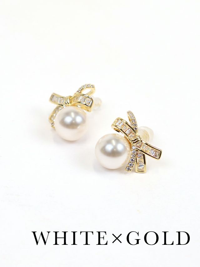 存在感抜群の大きめピアス♪ 大粒パール×ビジュースクエアモチーフピアス(ホワイト×シルバー/ホワイト×ゴールド)