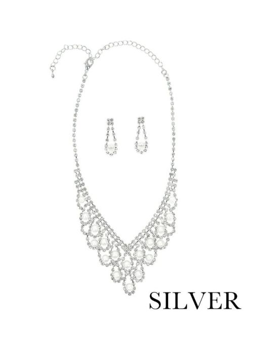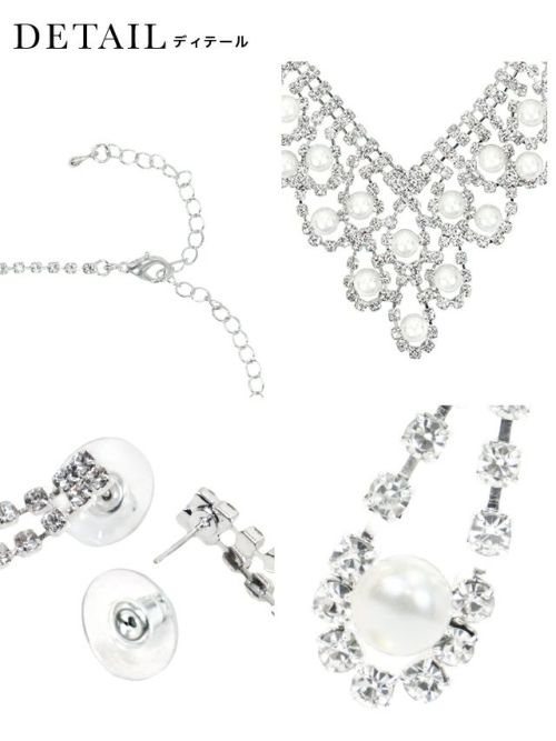 特別な日にぴったりのアクセサリー♪ ラインストーン×パールアクセサリー2点セット[ネックレス+ピアス](シルバー)
