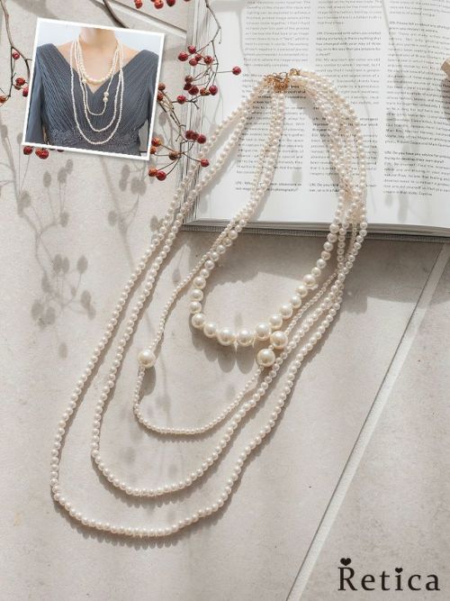 付けるだけで華やかに♪ 大小パールミックスデザイン4連ロングパールネックレス(ホワイト)