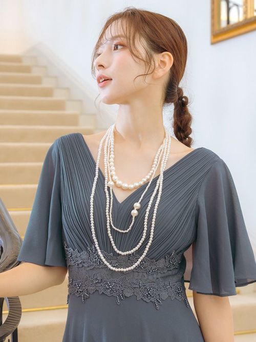 袖ラメレースシフォンフレアロングパーティードレス (Sサイズ~4Lサイズ)
