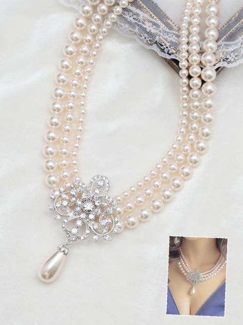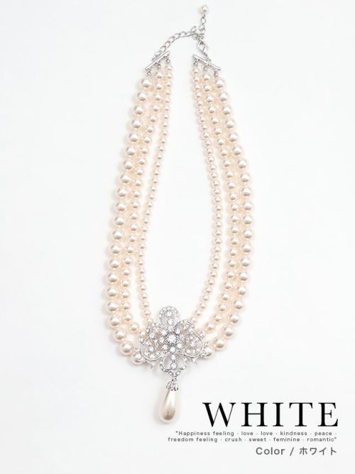ビジュー付きドロップパールデザイン三連ネックレス (ホワイト)