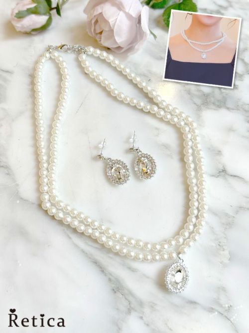 3. 二連パール ビジューチャーム ネックレス×ピアス アクセサリー2set