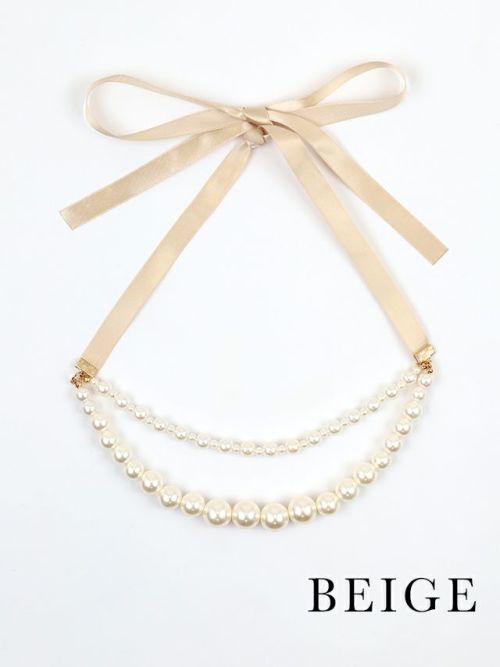 バックリボンが上品さをよりアップ♪ バックリボン×2連パールネックレス(ベージュ/ブラック)