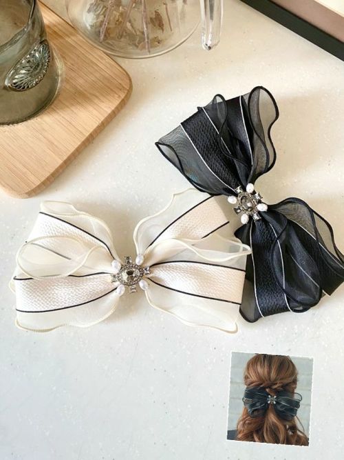3. ビジュー付きバイカラーリボンバレッタ (アイボリー/ブラック)