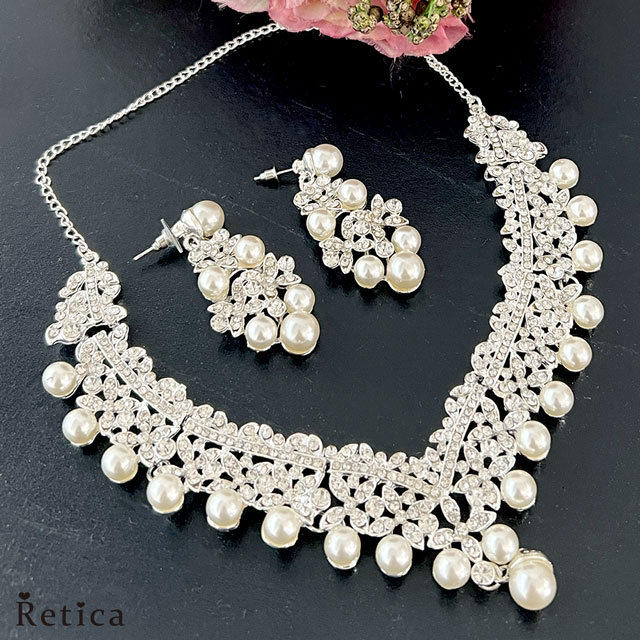 4. パール×ビジューデザインアクセサリーセット(ネックレス×イヤリングorピアス)(シルバー)