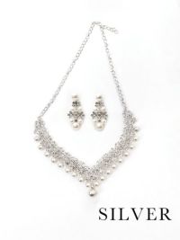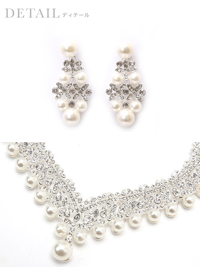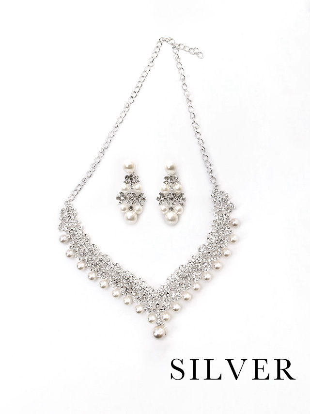 パール×ビジューデザインアクセサリーセット(ネックレス×イヤリングorピアス)(シルバー)