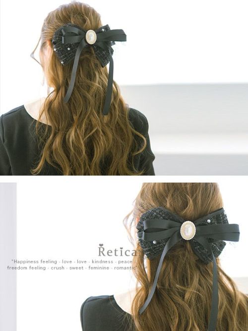 3. パール付きツイード生地ビッグリボンヘアアクセサリー (ブラック)