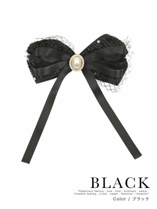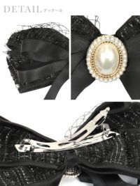 パール付きツイード生地ビッグリボンヘアアクセサリー (ブラック)