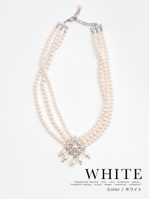 三連デザインパールロングネックレス (ホワイト)