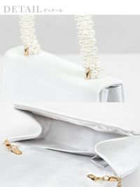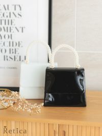 上品パールハンドルバッグ♪ ショルダーチェーン付きパールハンドルエナメル2Wayバッグ(ホワイト/ブラック)