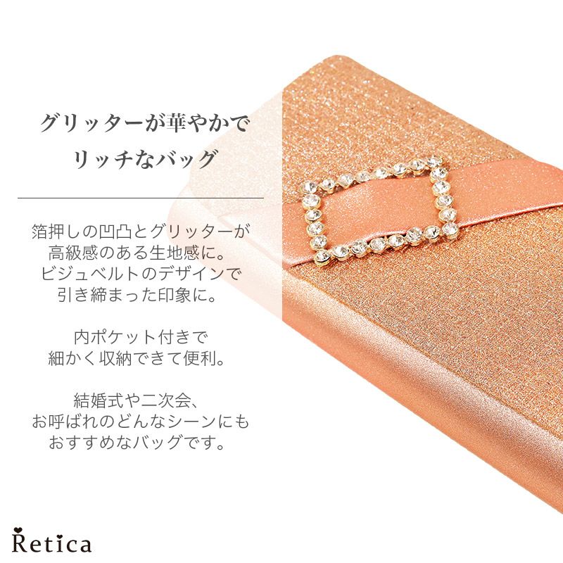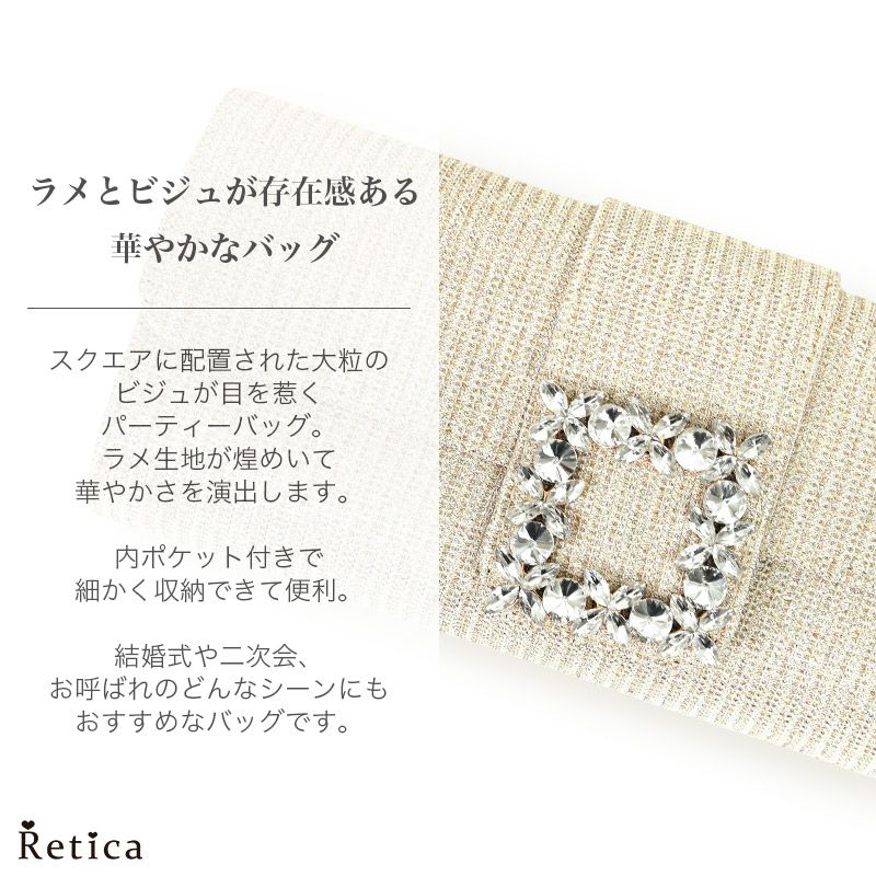 ドレスを選ぶ際に気を付けるべきポイントの目立ち過ぎないものに対して、バッグはきらきらと華やかさを演出するための重要なアイテムです。 Reticaでは控えめになりすぎないビジューやパールビーズを使ったデザインのものを取り揃えました。 お呼ばれの際に持つべきバッグは、荷物をしまうものではなくドレスの一部と考えて選ぶのがポイントになります。 ドレスでは控えた方が良い光沢のある素材も、バッグでは華やかさを演出するために必須と言っても良いでしょう。 必要最低限の荷物が入る程度の小さいサイズで、靴などと色を合わせると素敵なコーディネートになります。 夜間の結婚式・披露宴の場合は、きらきら輝くビジューが付いているようなバッグでも大丈夫です。