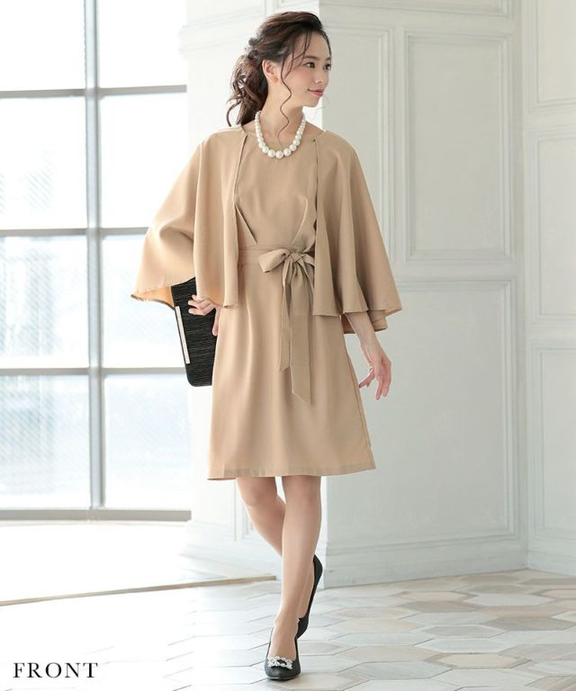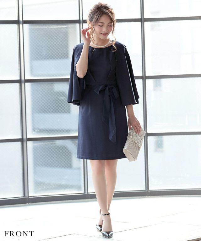 ドレープケープ七分袖ウエストリボンミニパーティードレスのフロント全身