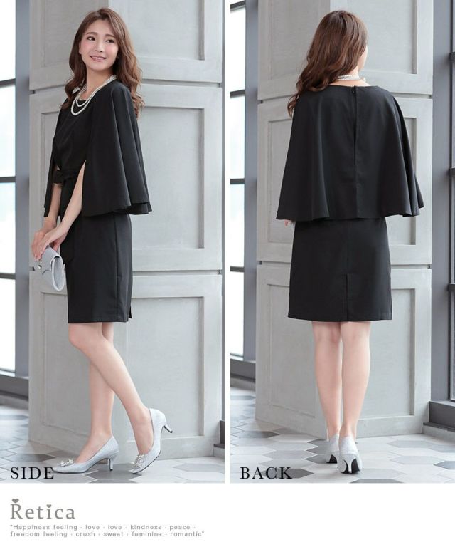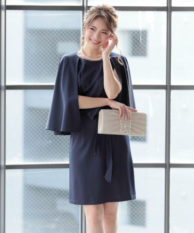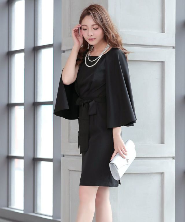 3. ドレープケープ七分袖ウエストリボンミニパーティードレス (Sサイズ~XXLサイズ)