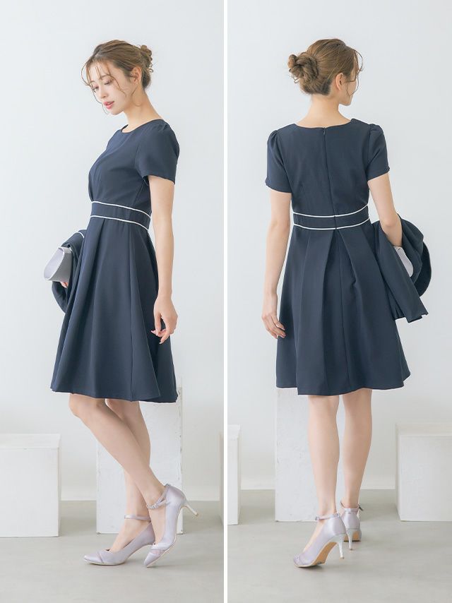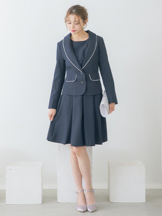 他の画像を見る クラッシックなワンピーススーツ♪ [SALE] パイピングノーカラージャケットワンピースセレモニースーツ (S~4Lサイズ) (ネイビー/ブラック) 通常価格 ¥ 15,180 のところ ¥ 7,590 税込 カートに入れる