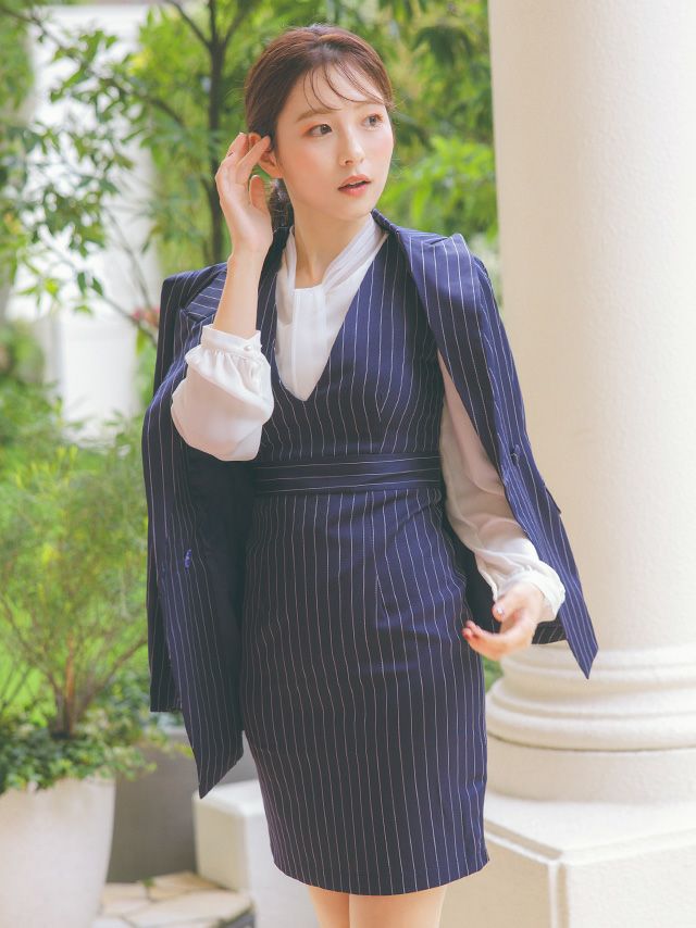 他の画像を見る タイトなシルエットで着痩せ効果抜群♪ [SALE] ストライプジャケット&Vネックワンピースセットアップセレモニースーツ (S~2Lサイズ) 通常価格 ¥ 10,780 のところ ¥ 4,290 税込 カートに入れる