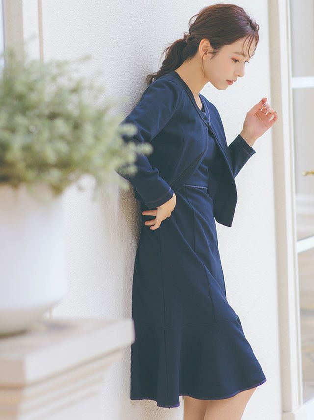 他の画像を見る クラッシックなワンピーススーツ♪ [SALE] パイピングノーカラージャケットワンピースセレモニースーツ (S~4Lサイズ) (ネイビー/ブラック) 通常価格 ¥ 15,180 のところ ¥ 9,900 税込 カートに入れる
