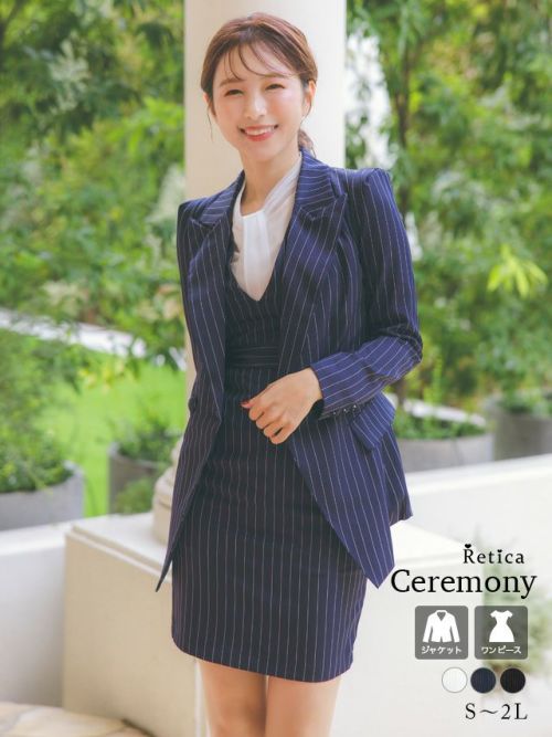 着痩せ効果◎美シルエットスーツ♪ [SALE] ストライプジャケット&タイトスカートワンピース セットアップセレモニースーツ (S~XLサイズ) (ホワイト/ネイビー/ブラック)