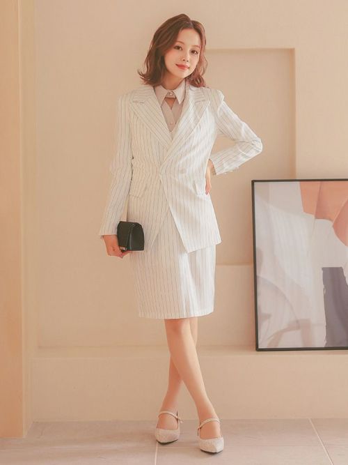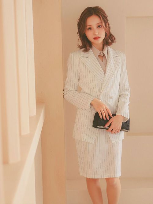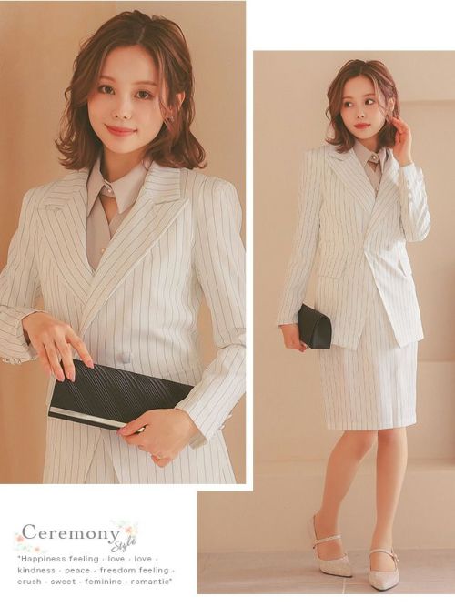 4. [SALE] ストライプジャケット&タイトスカートワンピース セットアップセレモニースーツ (S~XLサイズ) (ホワイト/ネイビー/ブラック)