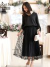 スタイルアップも叶う大人可愛いセットアップドレス(^^) [SALE] セットアップウエストリボン袖ありトップス×レーススカートパーティードレス (Sサイズ~XXLサイズ)