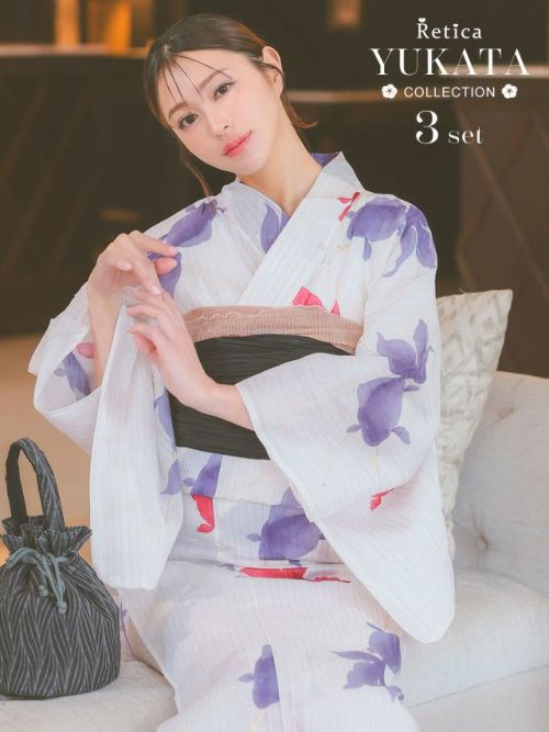 綿麻生地クリーム生地に縦線模様×金魚柄レディース浴衣3点セットのセット内容