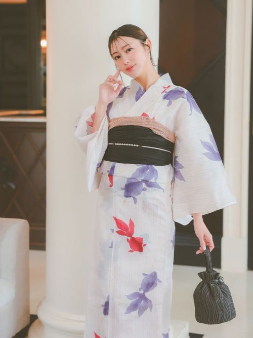 綿麻生地クリーム生地に縦線模様×金魚柄レディース浴衣3点セットの商品詳細3