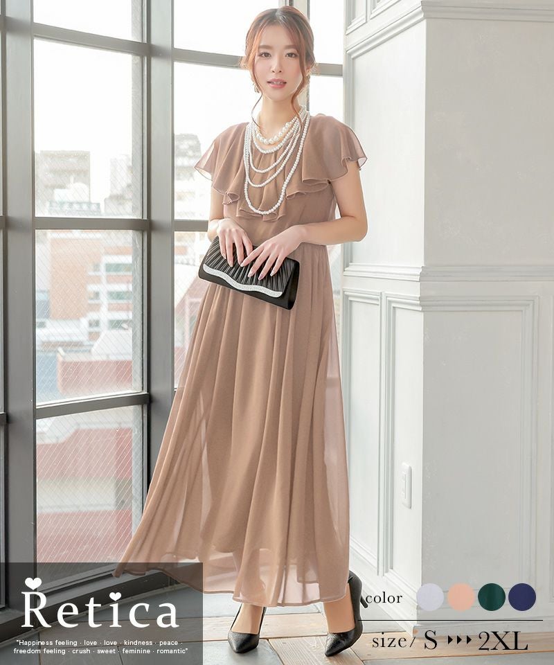 4. シフォン半袖フリルワンカラーウエスト切替ロングパーティードレス (Sサイズ~XXLサイズ)