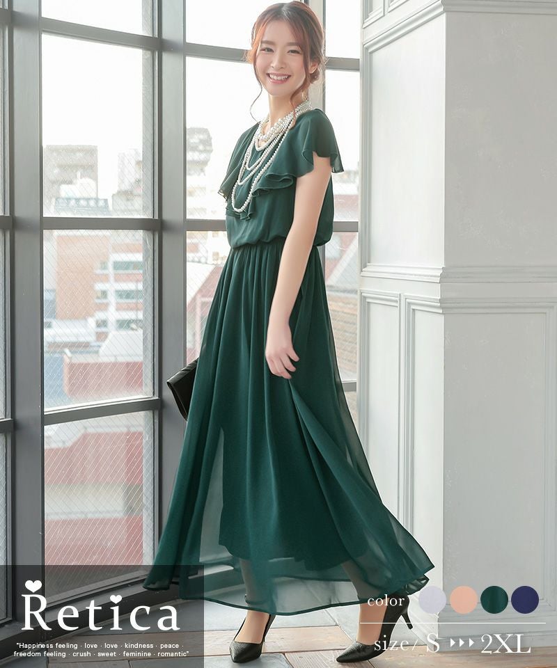 ロングドレスでスタイルアップ♪ 半袖フリルシフォンウエストゴムロングパーティードレス (Sサイズ~XXLサイズ)