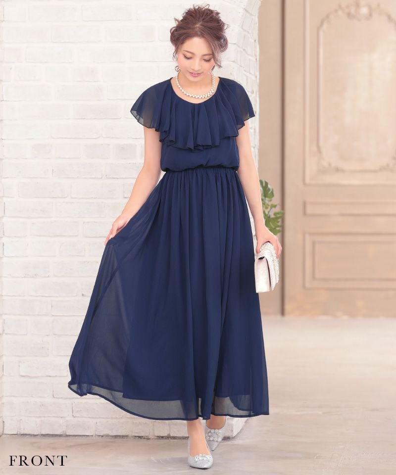 3. 半袖フリルシフォンウエストゴムロングパーティードレス (Sサイズ~XXLサイズ)