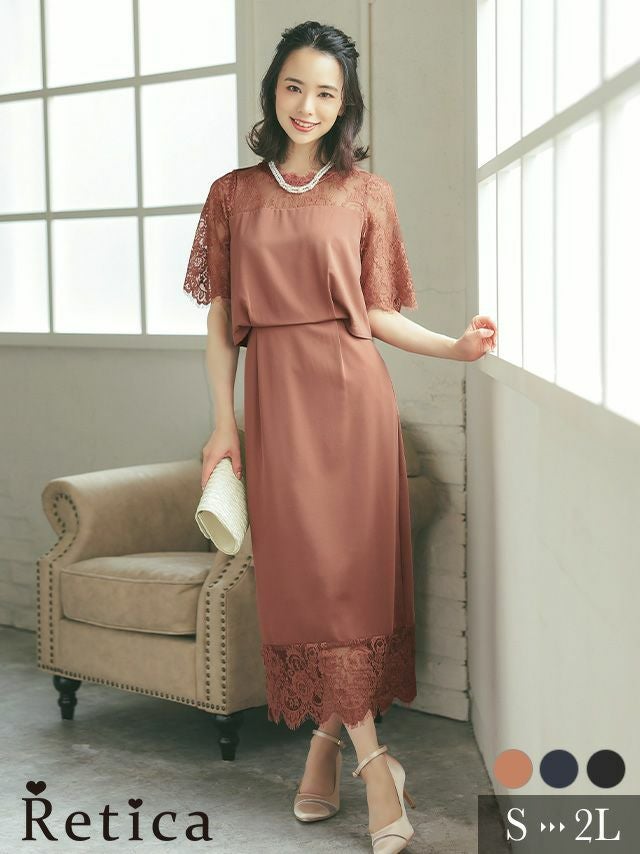 3. レーススリーブウエスト切替タックロングパーティードレス (Sサイズ~XLサイズ)