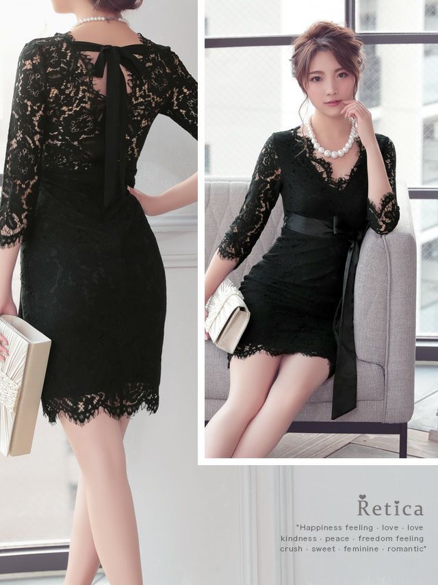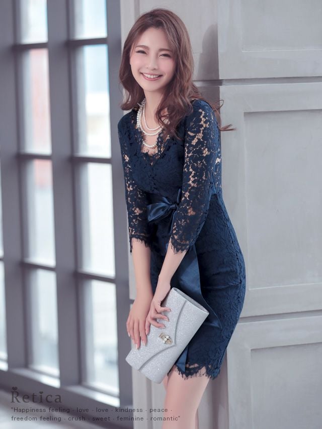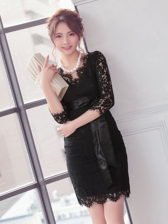 4. 総レースWリボンタイトミニパーティードレス (Sサイズ~XXLサイズ)