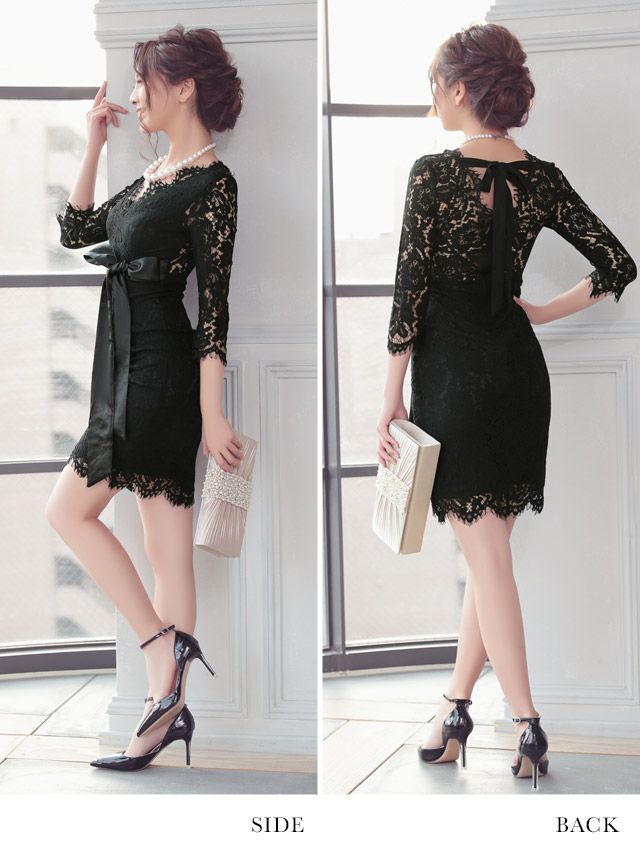 シックな大人ドレス★ 総レース×リボンデザインタイトミニパーティードレス (Sサイズ~XXLサイズ)