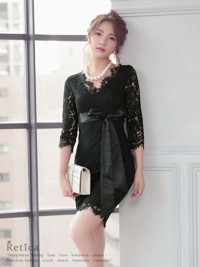 4. 総レース七分袖ウエストリボンタイトミニパーティードレス (Sサイズ~XXLサイズ)