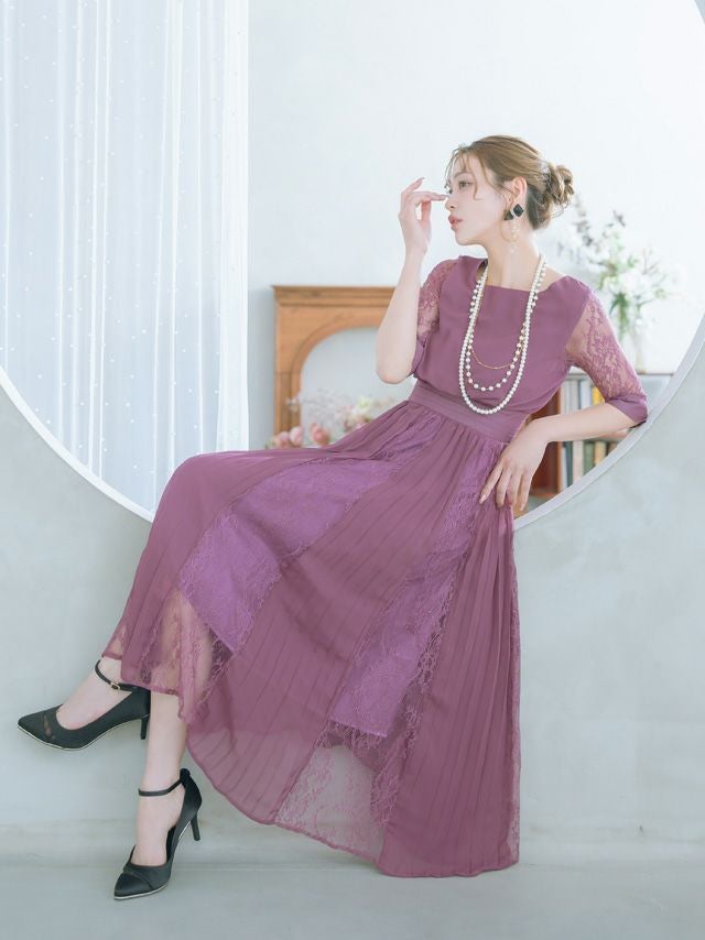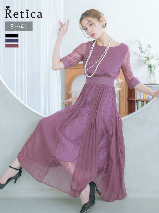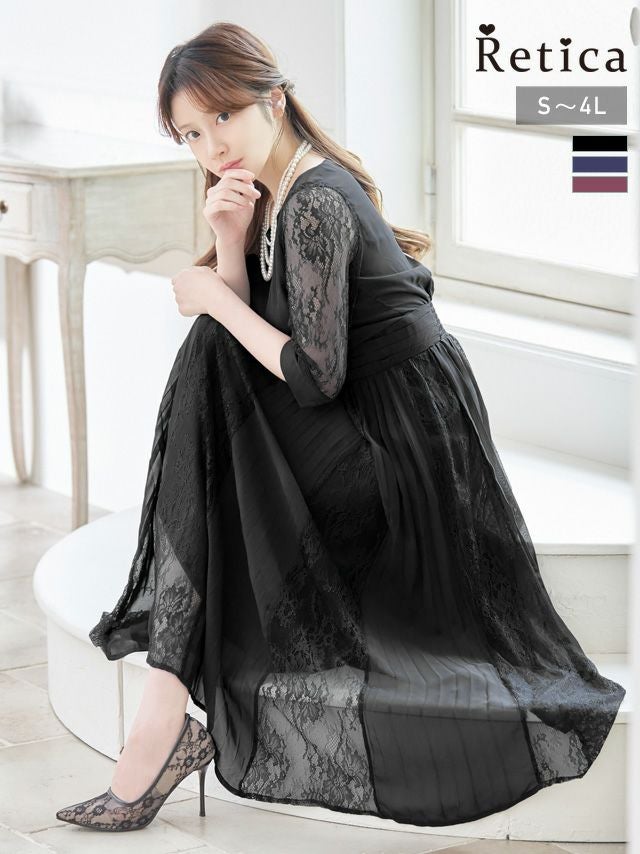 シフォン×レース切替スカートが魅力的♪ [SUPER SALE] チュール5分袖ラウンドネックシフォンレースAラインロングパーティーワンピースドレス (Sサイズ~4Lサイズ)