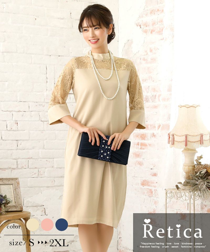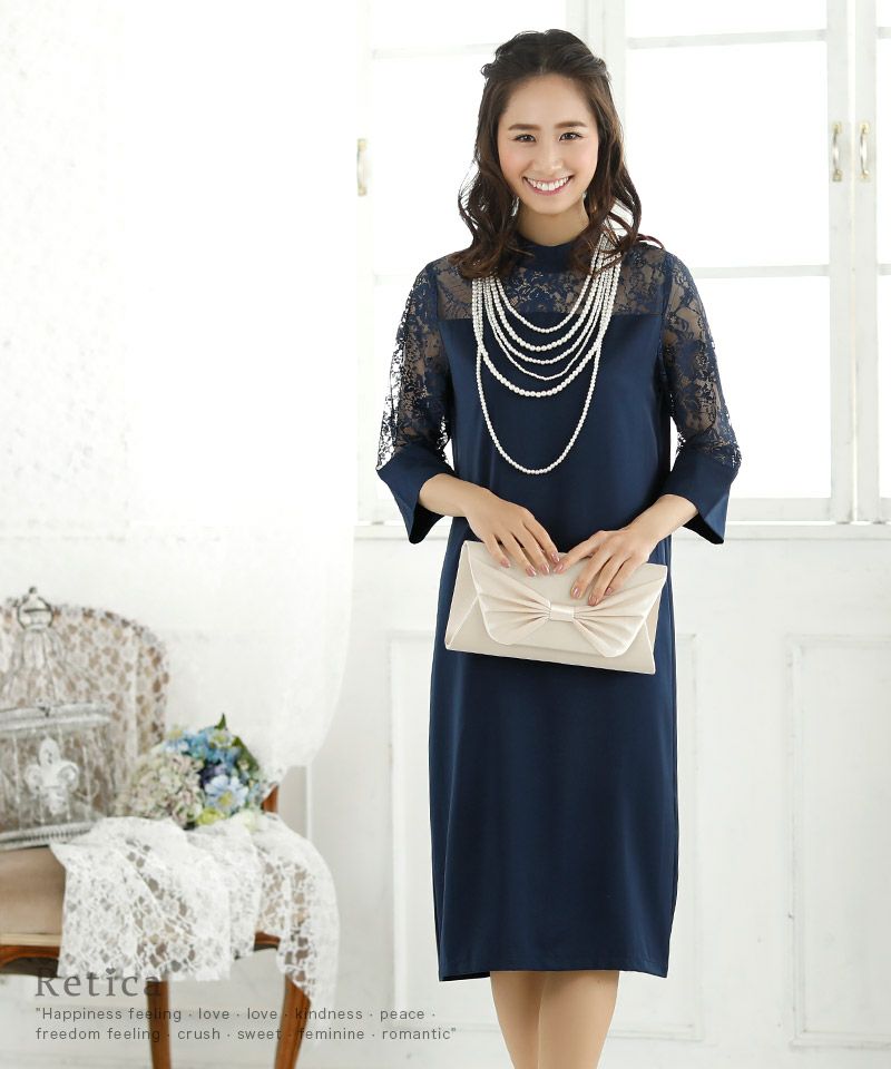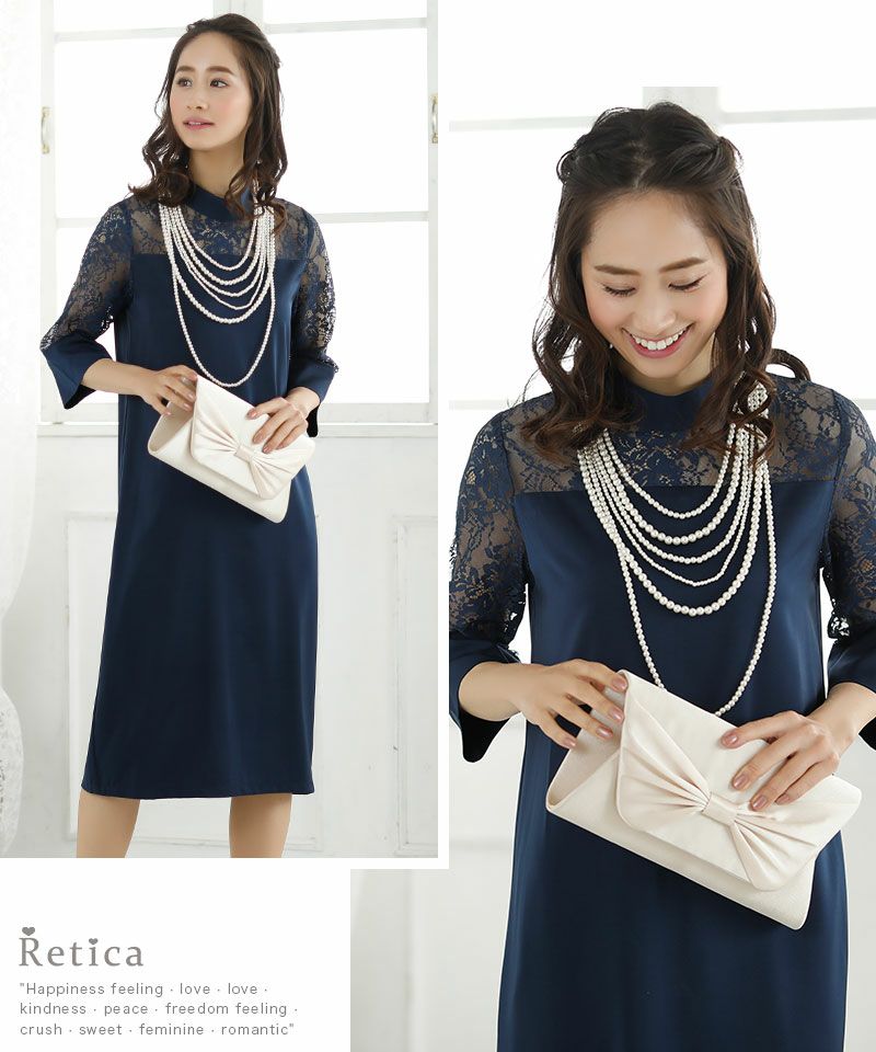 パーティードレス 結婚式 ボックスワンピースレース切り替え袖ありワンピースドレス