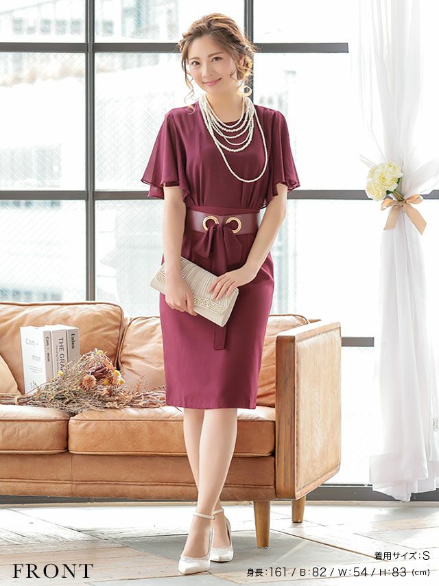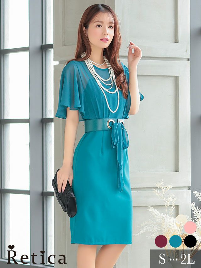 フェミニンな鮮やかカラー♪ シフォンフレア袖ウエストマークデザインプチプラパーティードレス (Sサイズ~XLサイズ)