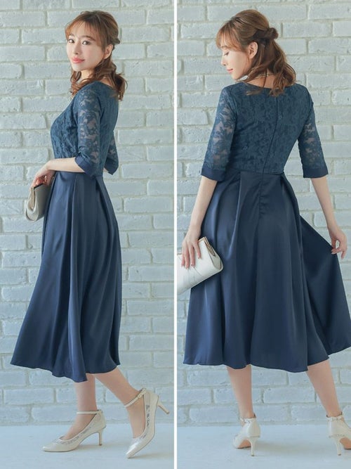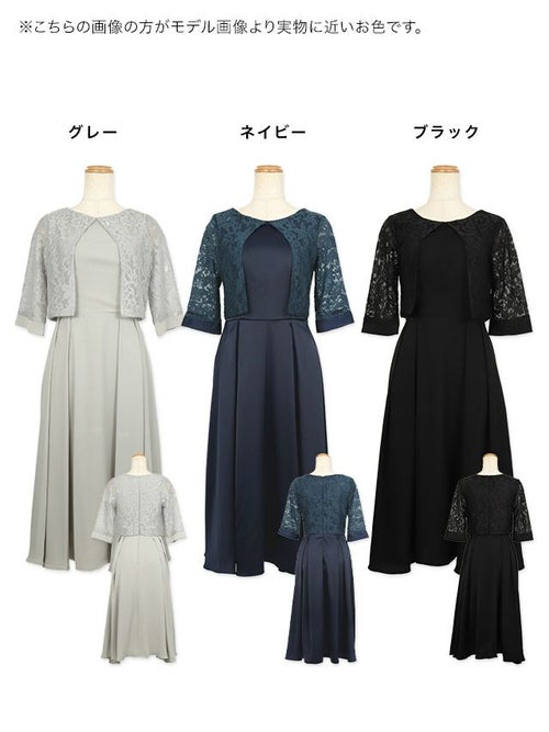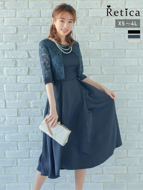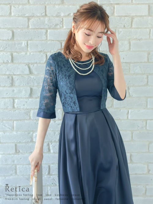 まるでショート丈ジャケットを羽織っているように見えるデザインです。ドレス1枚でコーデに華があるのでボレロなしでも成立します。露出が少ないドレスなので、肌をあまり見せたくない人におすすめです。黒系のバッグと合わせると全体が締まってスッキリ見えます。