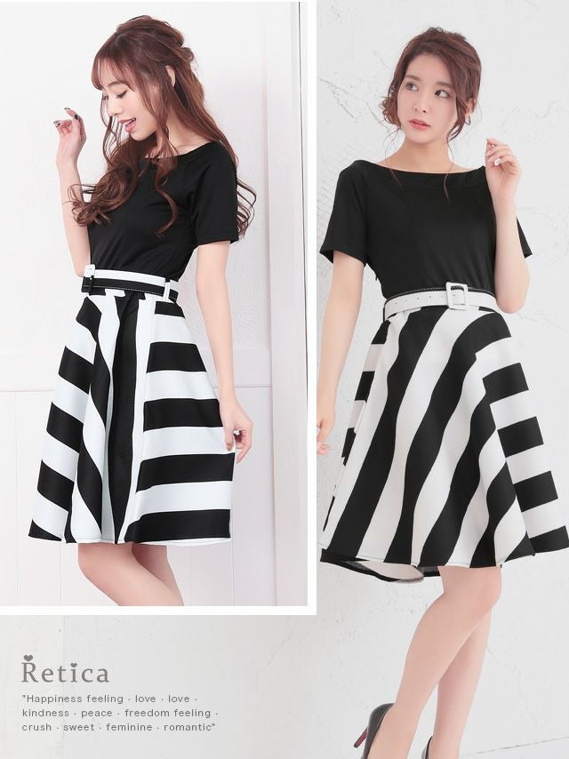 4. 袖ありウエスト切替ベルトフレアワンピースプチプラパーティードレス (Sサイズ~Lサイズ)