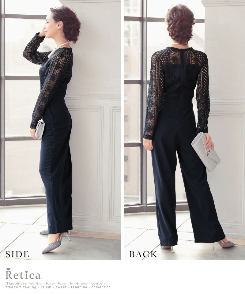 パーティードレス パンツ レース長袖ワンカラーパンツドレス